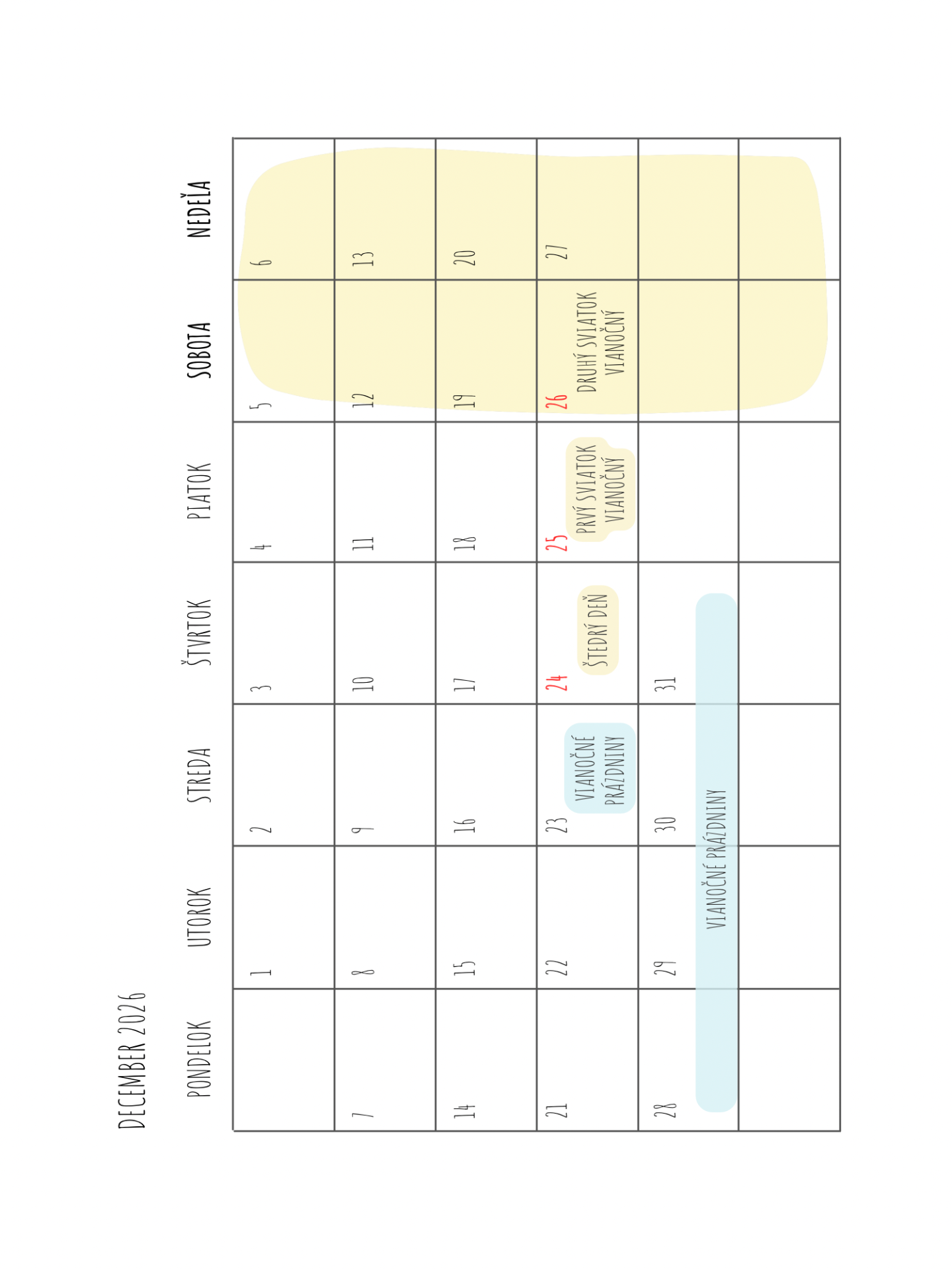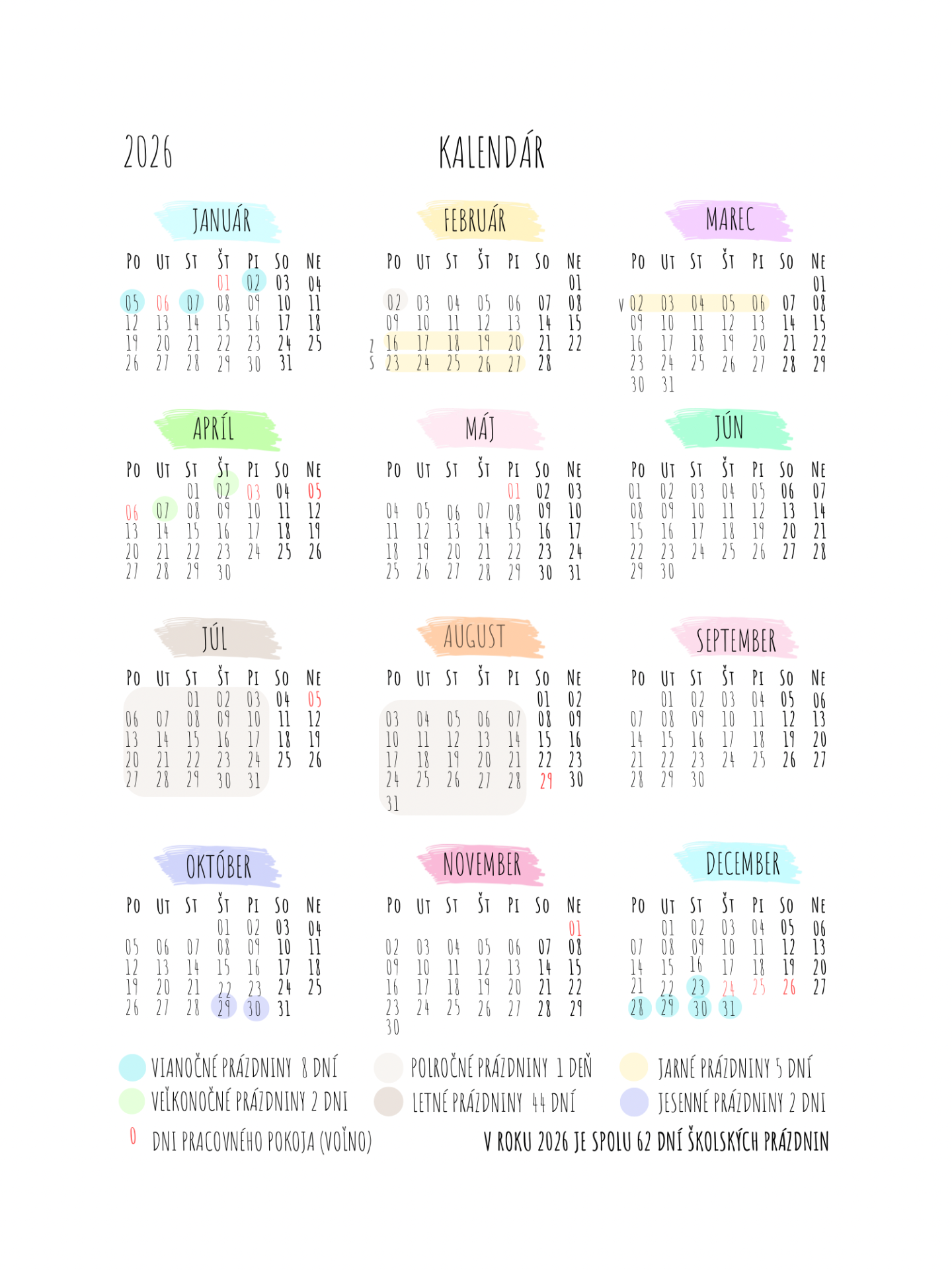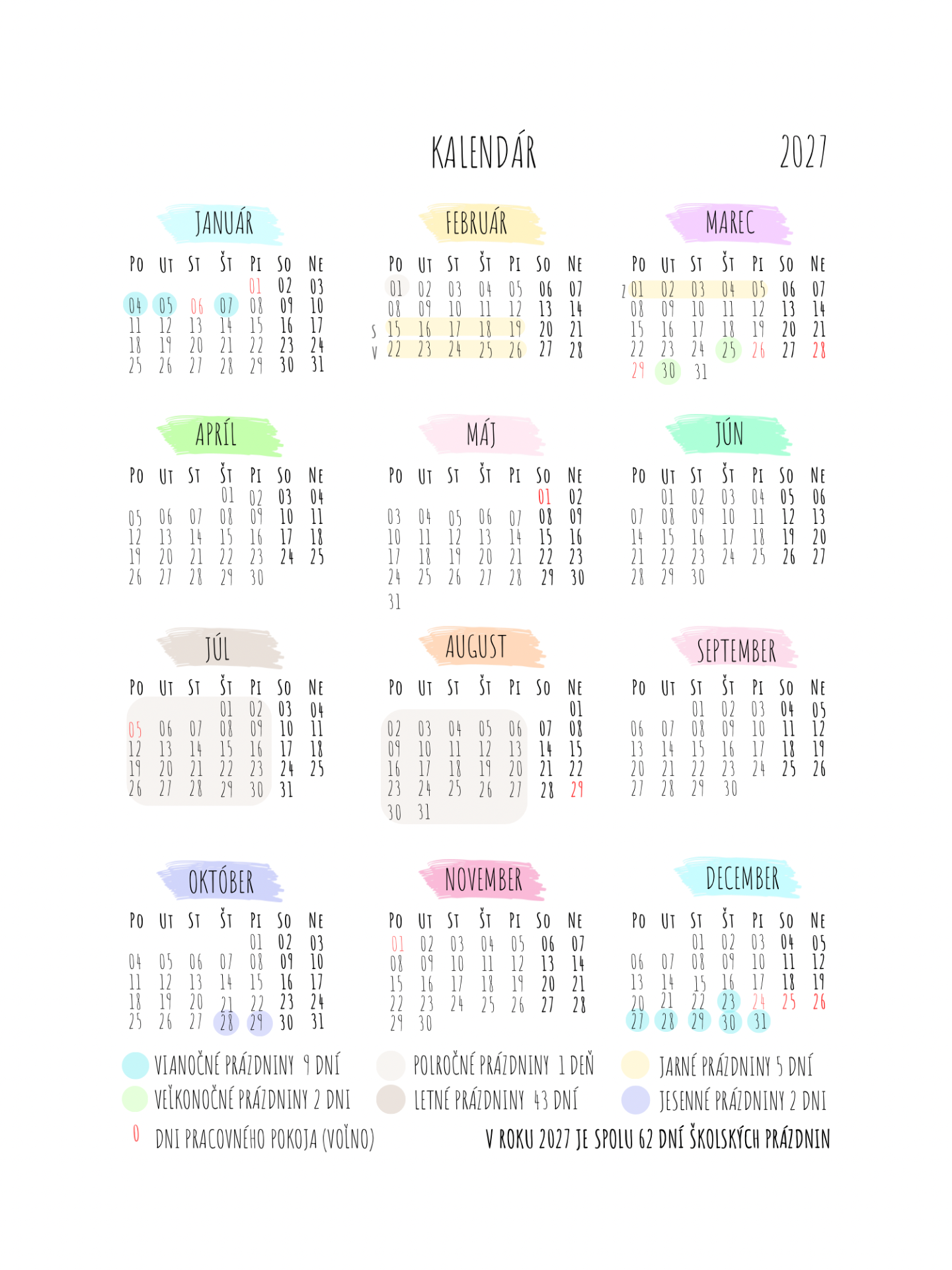 - kalendár na rok 2026, 2027 s vyznačenými prázdninami a sviatkami