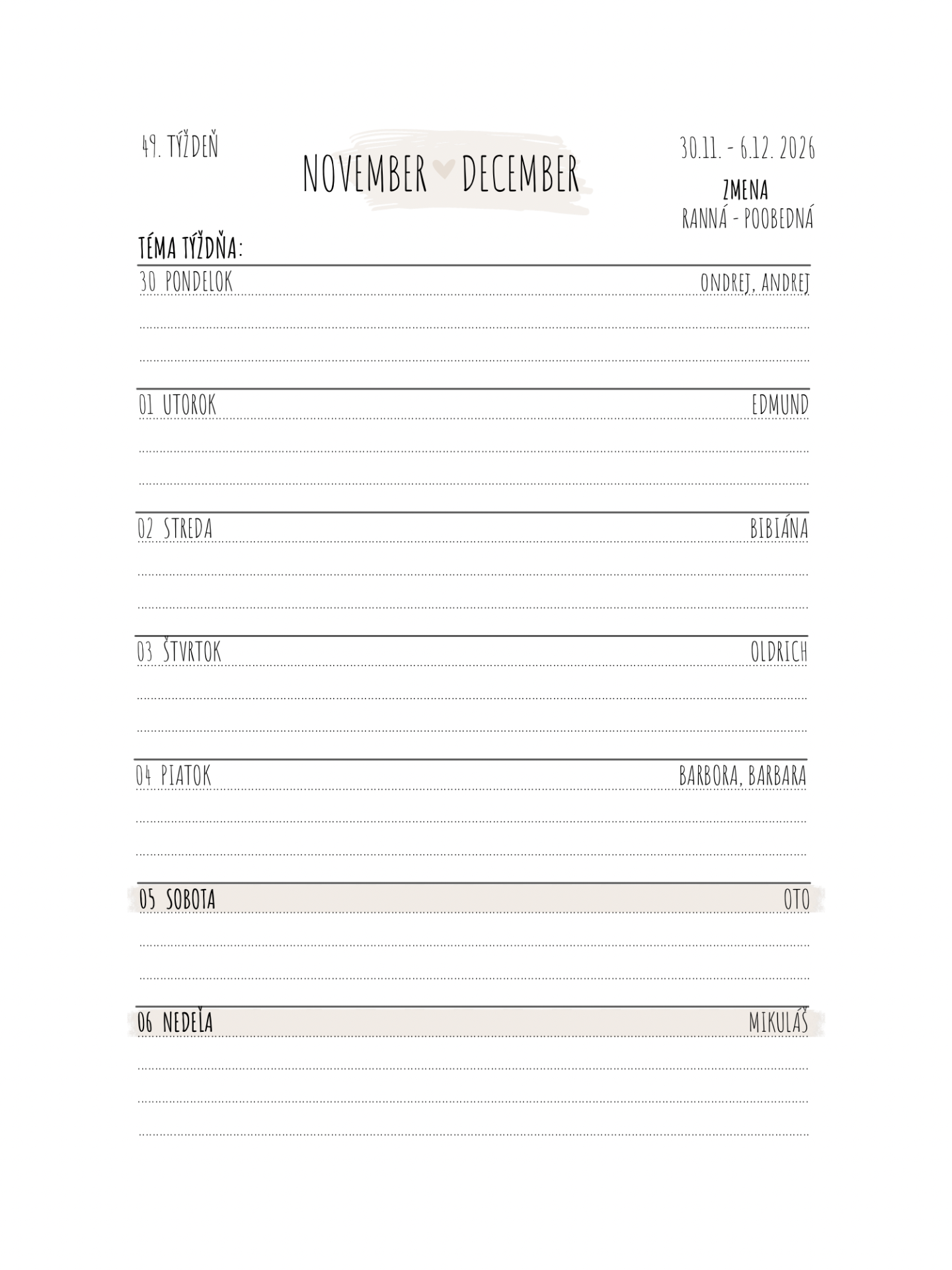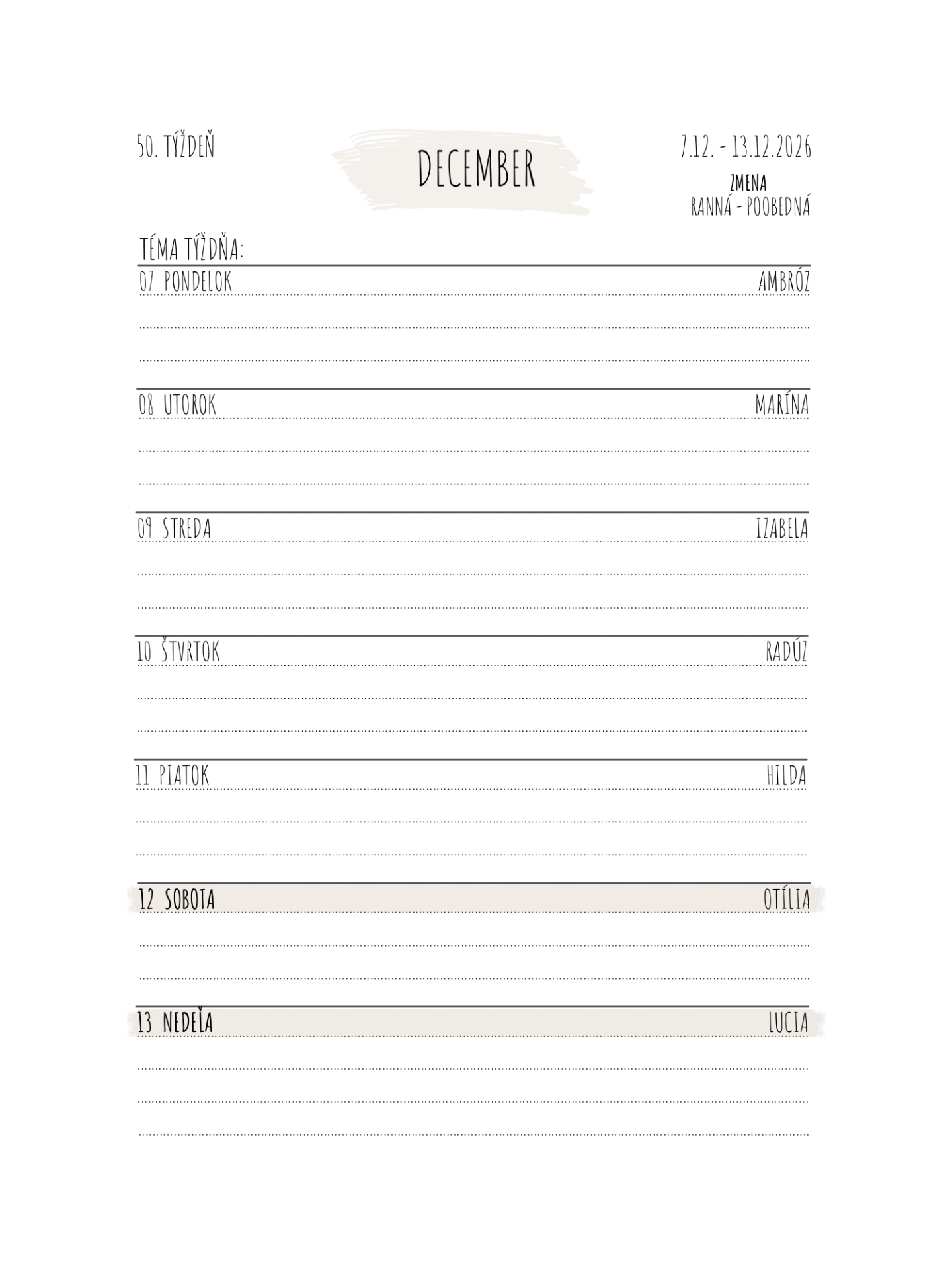 - týždenný diár od augusta 2026 do augusta 2027. Každá dvojstrana týždenného kalendára obsahuje jeden týždeň s menným kalendárom a priestorom na vyznačenie pracovnej zmeny a témy týždňa